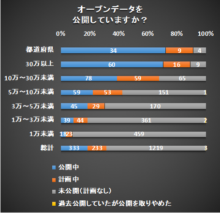 オープンデータの取組に関する自治体アンケート結果(内閣官房IT総合戦略室、平成28年12月実施)によれば、自治体の規模が小さくなるほどオープンデータを公開している自治体の割合は少なくなります。都道府県や、規模の大きな基礎自治体からオープンデータが進んでいることがわかります。
