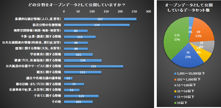 一方、自治体がオープンデータとして公開しているデータセット数、つまりオープンデータの種類は多くありません。6割の自治体は30種類以下で、10種類以下の自治体も4割弱あります。