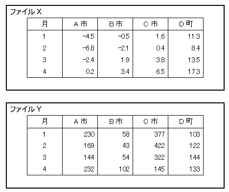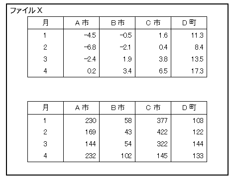 左図に示すファイルは、複数の表を含んでいます。このようなファイルをコンピュータが判読するためには、表の切れ目を扱う必要があり、判読手順が複雑になります。このため、1個のファイルは、1 種類の表からのみ構成されるべきです。