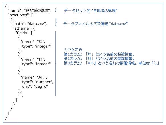ヘッダに単位を付記する(右図)か、Tabular Data Packageという規格に基づいたこのファイルの説明を別途付記する(下図)ことにより、フィールドの単位を明記できます。
