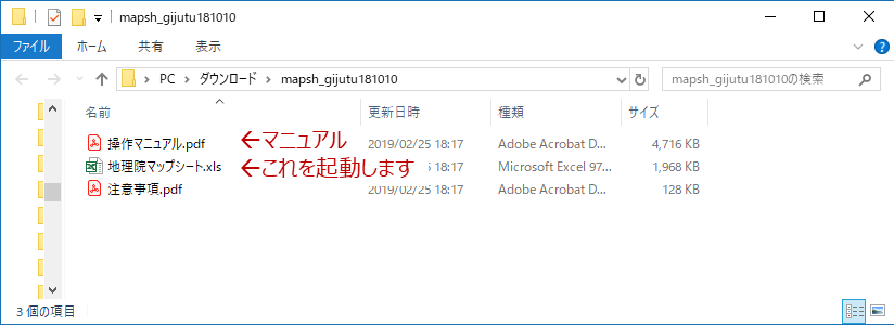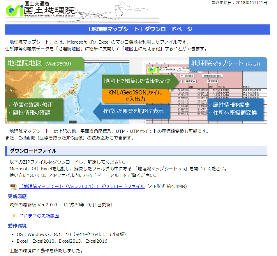ダウンロードページにある「地理院マップシート」ダウンロードファイルのリンクから、Zipファイルをダウンロードし、これを解凍して得られる「地理院マップシート.xls」を起動します。