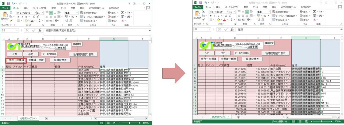 住所の列を全選択し「住所→座標値」ボタンを押すと、緯度・経度欄に値が入力されます。
