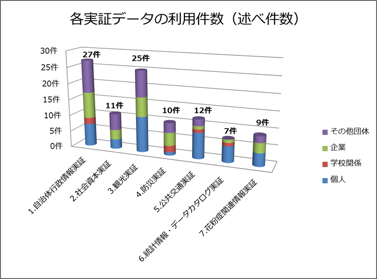 | 全体 | 1.自治体行政情報実証 | 2.社会資本実証 | 3.観光実証 | 4.防災実証 | 5.公共交通実証 | 6.統計情報・データカタログ実証 | 7.花粉症関連情報実証 | |